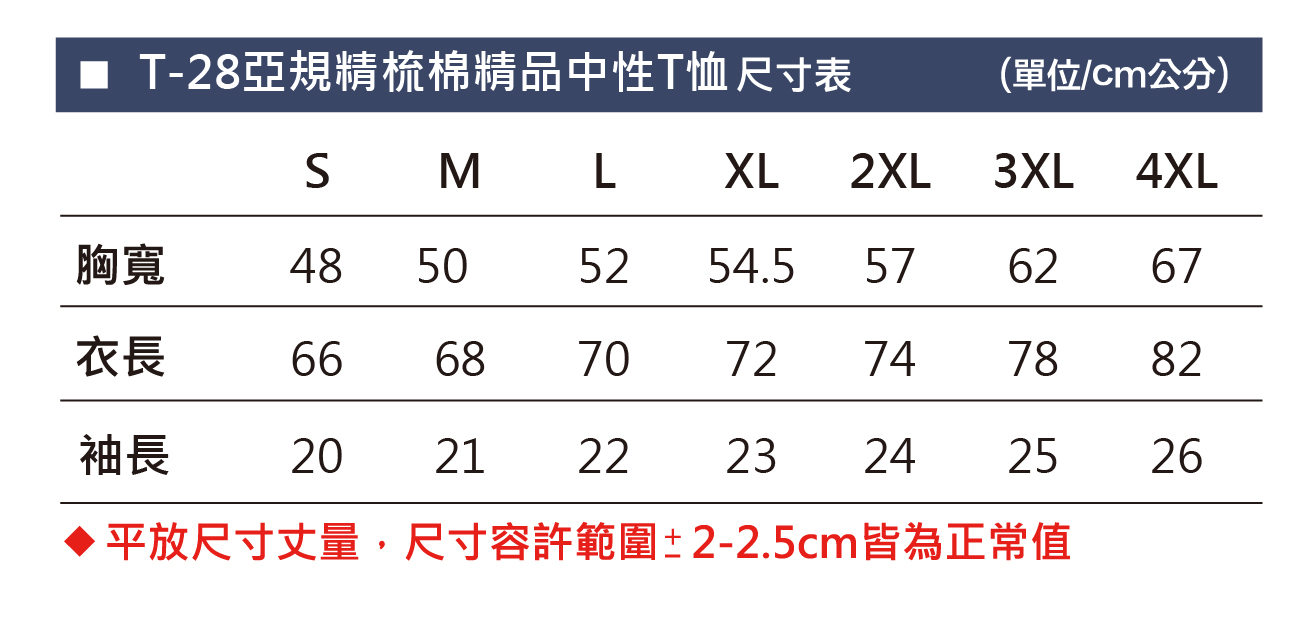 首頁 線上購物 亞規精梳棉精品中性T恤 商品分類 商品優惠 商品分類: 銷量TOP10 限時促銷 現貨熱銷 商品分類: 短褲 帽拉 帽子 帽T 背心 長褲 大學T T恤 Polo衫 品牌分類: CHAMPION DICKIES RUSSELL ATHLETIC GILDAN CP SPORTS TOP HOODIE POLONE1 KY 衣庫 1 商品優惠: 1 本商品適用活動: KY T_28 亞規精梳棉精品中性T恤 已賣出:1,859件 商品編號:T_28 本商品適用活動: 付款與運送 付款方式 信用卡一次付款、ATM付款、街口支付、LINE PAY 運送方式 宅配到府,每筆NT$100,滿NT$2500(含以上)免運費 最低訂購量 0 商品資訊 商品規格 ●210g/m(每平方碼6.1盎司)●22支精梳棉,高溫預縮處理 ●100%精梳棉,預縮平紋針織布料●中麻灰:90%精梳棉/10%聚酯纖維●2公分羅紋領 ●領口及肩膀均有壓肩條●雙針袖口及下擺折邊 ●根據亞洲身形剪裁●時裝潮流修身版型 ●易撕領標●精工縫製,無比耐穿●精品等級燒毛處理,最適合各種印刷,節省前置處理成本,印色精細鮮艷 ●經過台灣SGS及ITS公正檢驗出口合格標章 單色下單 多色下單 訂購數量與尺寸 顏色 5色 黑色 白色 藏青色 麻灰色 紅色 黑色 白色 藏青色 麻灰色 紅色 顏色 顏色圖點圖可放大SMLXL2L3L4L 黑色01 白色02 藏青色03 麻灰色04 紅色05 回上一頁 分享 分享